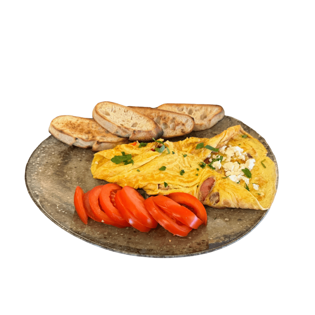(ouă, cârnați, telemea, ardei gras, pătrunjel, roșii, pâine) – 360g